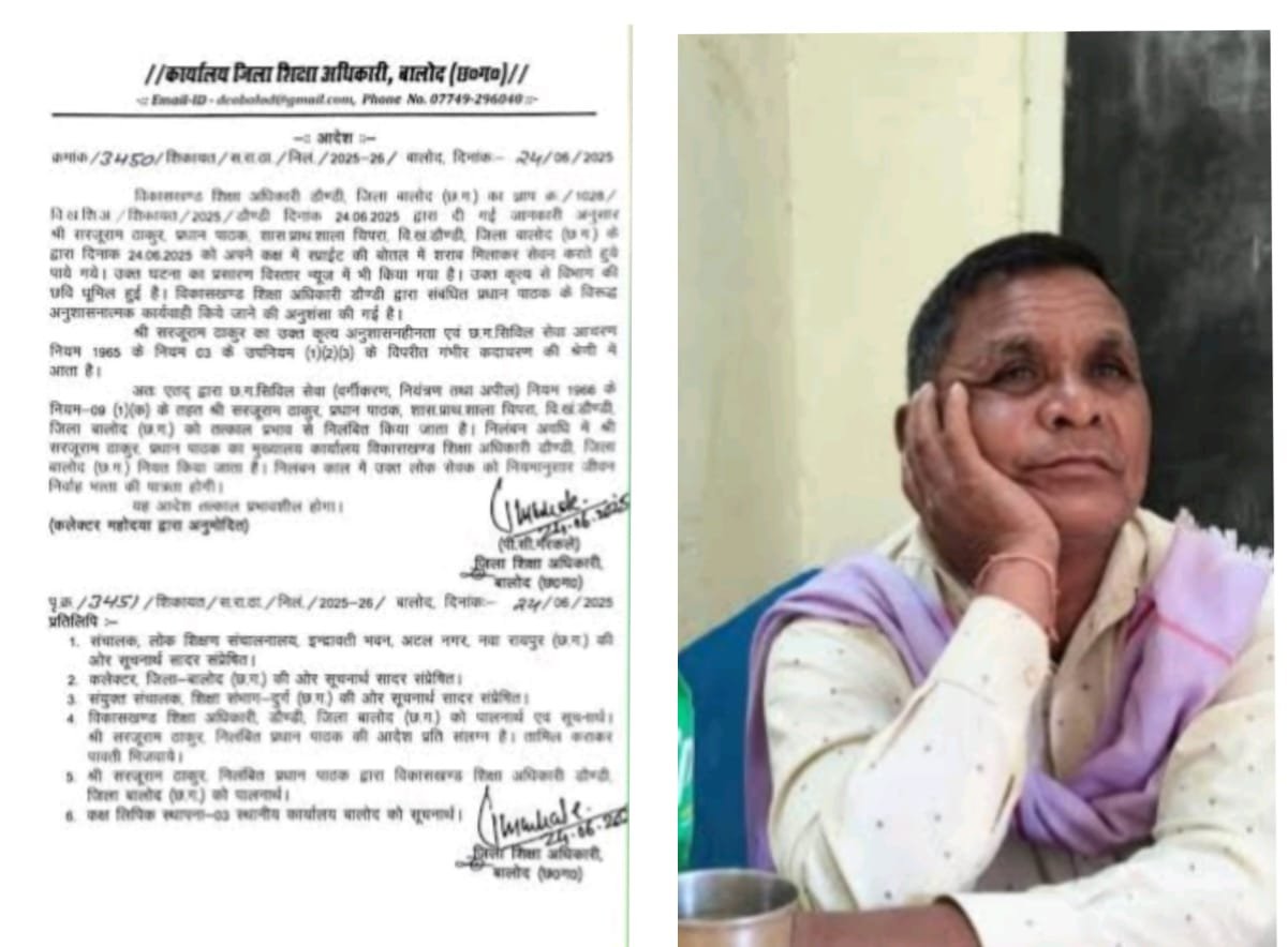 CG Suspend-“शिक्षा की पवित्रता पर चोट: शिक्षा की गरिमा को किया शर्मसार”,,,,,,प्रधानपाठक सस्पेंड—विद्यालय में मदिरा पान का सनसनीखेज मामला” June 25, 2025 No Comments Read More »