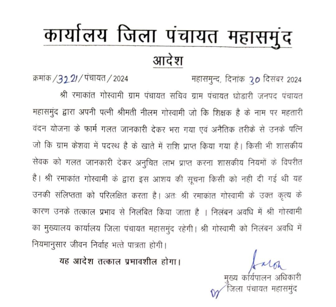 खबर का असर घोड़ारी ग्राम पंचायत सचिव रमाकांत गोस्वामी निलंबित! महतारी वंदन योजना मे सचिव द्वारा अपनी शिक्षिका पत्नी का गलत तरीके से फार्म भरकर लाभ दिलाये जाने पर संलिप्ता पाये जाने पर निलंबित किया गया! December 30, 2024 No Comments Read More »