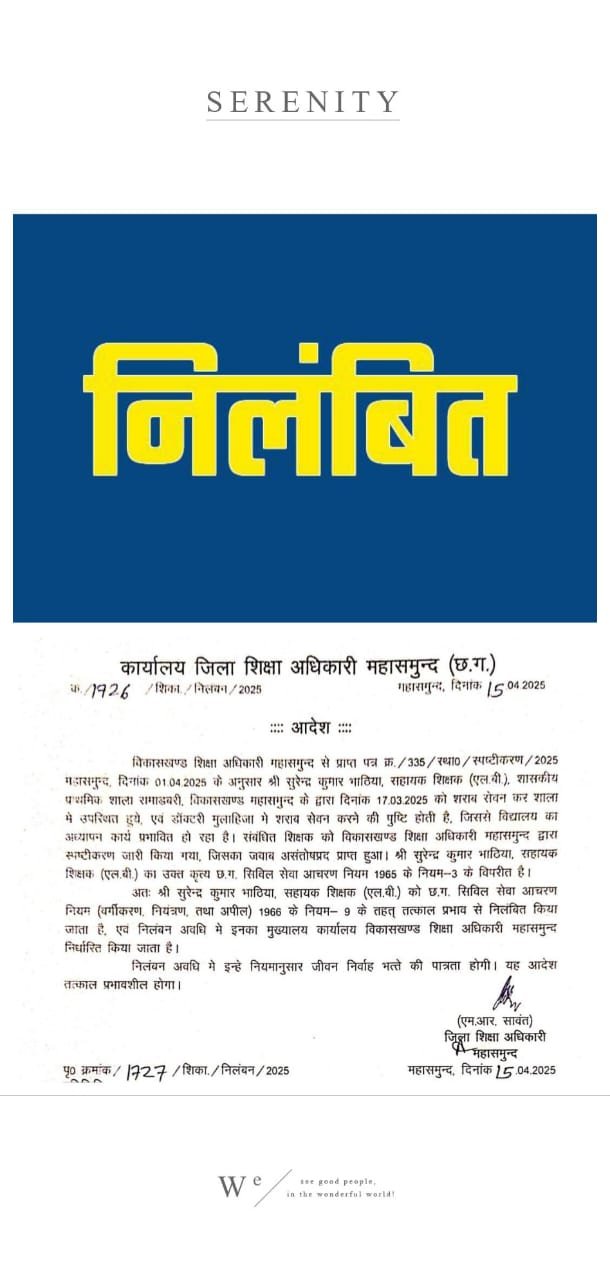 अतः सुरेन्द्र कुमार भाठिया, सहायक शिक्षक (एल.बी.) को जिला शिक्षा अधिकारी एम आर सावंत ने छ.ग. सिविल सेवा आचरण नियम (वर्गीकरण, नियंत्रण, तथा अपील) 1966 के नियम 9 के तहत् तत्काल प्रभाव से निलंबित किया है, एवं निलंबन अवधि मे इनका मुख्यालय कार्यालय विकासखण्ड शिक्षा अधिकारी महासमुन्द निर्धारित किया गया है।निलंबन अवधि मे इन्हे नियमानुसार जीवन निर्वाह भत्ते की पात्रता होगी। यह आदेश तत्काल प्रभावशील होगा।