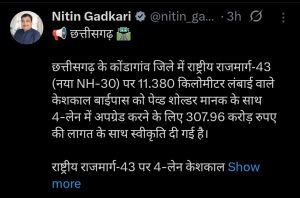 जब नितिन गडकरी ने अपने ट्विटर हैंडल से केशकाल बाईपास की स्वीकृति की जानकारी साझा की, तो बस्तर के लोगों की आंखों में उम्मीद की चमक दौड़ गई। उन्होंने लिखा: