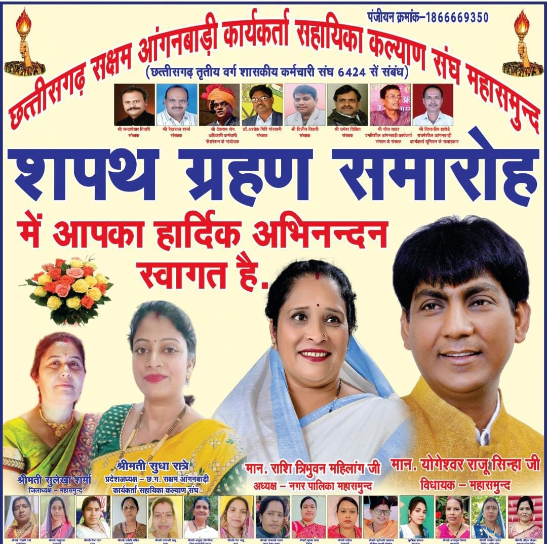 गौरतलब है कि पूरे छत्तीसगढ़ प्रदेश में आंगनबाड़ी कार्यकर्ता और सहायिकाओं द्वारा राज्य सरकार और केंद्र सरकार की योजनाओं को घर घर तक पहुंचाने का काम आंगनबाड़ी कार्यकर्ताओं सहायिकाओं द्वारा लगातार पूरी ईमानदारी और पूरी निष्ठा के साथ काम कर रही है। समय समय पर आंगनबाड़ी कार्यकर्ताओं और सहायिकाओं द्वारा अपनी मांगों को लेकर राज्य सरकार और केंद्र सरकार से अपने मांगो को पहुंचाने के लिए महासमुंद जिला सहित और छत्तीसगढ़ प्रदेश के हजारों कार्यकर्ताओं द्वारा छत्तीसगढ़ सक्षम आंगनबाड़ी कार्यकर्ता सहायिका कल्याण संघ की स्थापना कर राज्य सरकार के रजिस्टार एवम पंजीयक से पंजीयन करा कर संवैधानिक रूप से संगठन को संचालित किया जा रहा है। इसी कड़ी में कल 22 अगस्त को प्रदेश भर से उपस्थित आंगनबाड़ी कार्यकर्ता और सहायिकाएं छत्तीसगढ़ सक्षम आंगनबाड़ी कार्यकर्ता सहायिका कल्याण संघ के बैनर तले शपथ लेंगे और इस शपथ ग्रहण समारोह में छत्तीसगढ़ सक्षम आंगनबाड़ी कार्यकर्ता सहायिका कल्याण संघ की प्रदेश अध्यक्ष के रूप में श्रीमती सुधा रात्रे और अन्य पदाधिकारी अपने पद और गोपनीयता की शपथ लेंगे। कार्यक्रम का शुभारंभ 22 दिसंबर की सुबह 10 बजे से होगी।