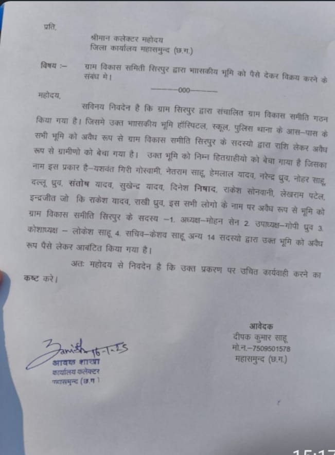 कलेक्टर से शिकायत पत्र में लिखा गया है कि ग्राम सिरपुर द्वारा संचालित ग्राम विकास समीति के सदस्यों द्वारा संरक्षित किया गया है जिसमें हॉस्पिटल, स्कूल, पुलिस थाना सहित अन्य संस्थानों के लिए आरक्षित भूमि को अवैध रूप से ग्राम विकास समीति सिरपुर के सदस्यो द्वारा राशि लेकर ग्रामीणों को बेच दिया गया है। सरकारी भूमि को यशवंत गिरी गोस्वामी, नेतराम साहू, हेमलाल यादव, नरेन्द्र ध्रुव, नोहर साहू, दल्लू ध्रुव, संतोष यादव, सुखेन्द्र यादव, दिनेश निषाद, राकेश सोनवानी, लेखराम पटेल, इन्द्रजीत, राकेश यादव, राखी ध्रुव को ग्राम विकास समीति सिरपुर के सदस्य अध्यक्ष-मोहन सेन, उपाध्यक्ष-गोपी ध्रुव, कोशाध्यक्ष – लोकेश साहू, सचिव केशव साहू अन्य 14 सदस्यो द्वारा उक्त भूमि को अवैध रूप पैसे लेकर आबंटित किया गया है।