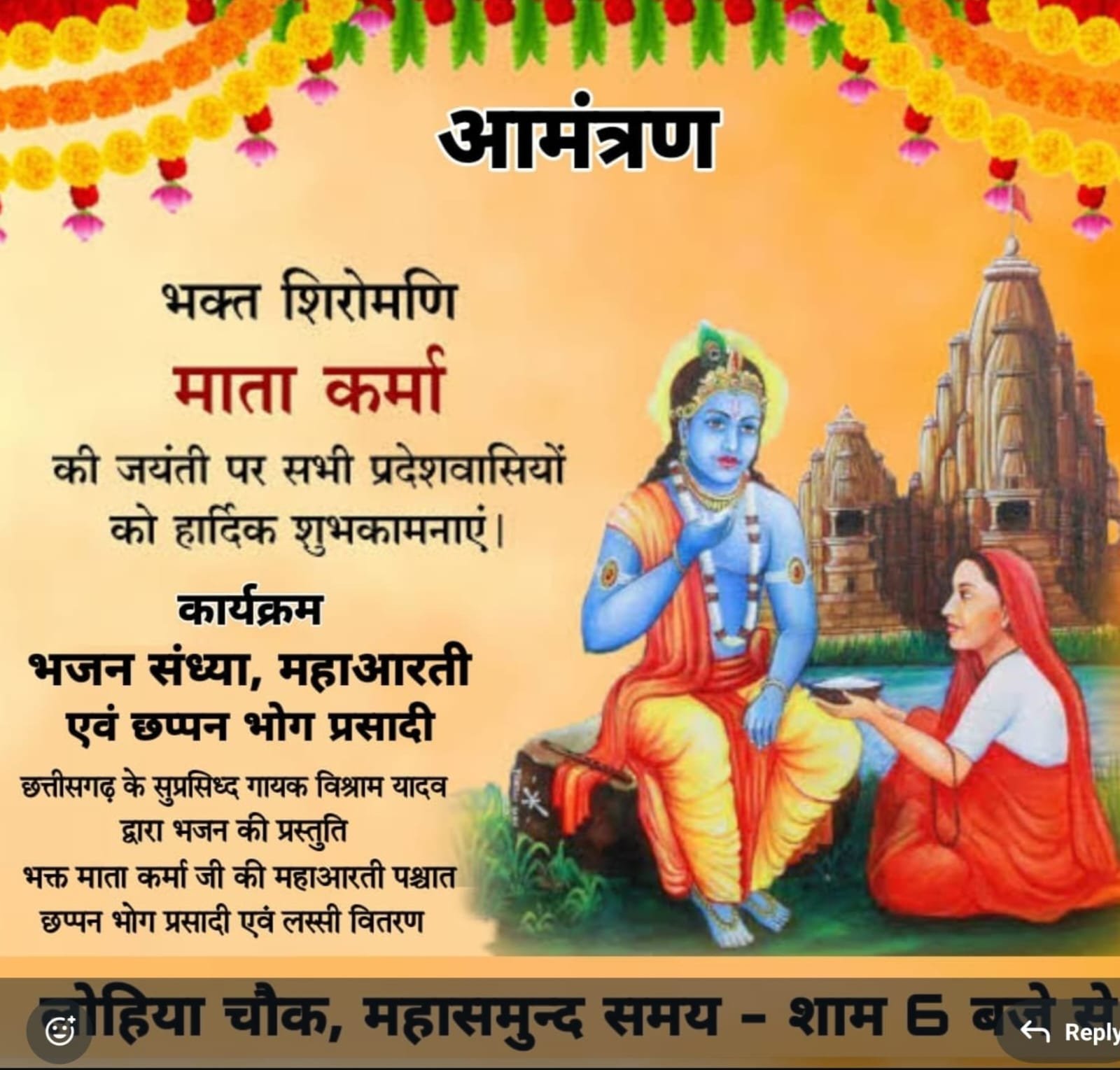 25 मार्च 2025 पाप मोचनी एकादशी पर साहू समाज महास मुंद द्वारा लोहिया चौक महासमुंद में समय शाम 6बजे तैलीक कुल की आराध्य देवी भक्त माता कर्मा जयंती पर महा आरती कर छप्पन भोग चढ़ाया जायेगा तदोपरांत प्रसादी वितरण किया जाएगा। प्रसादी वितरण के साथ साथ भजन संध्या का आयोजन किया गया है। माता कर्मा की जयंती के अवसर पर महासमुंद के समस्त स्वजातीय बंधु एवं सर्व समाज के समस्त बंधुओं को सादर आमंत्रित करते हैं। कार्यक्रम में आपकी गरिमामयी उपस्थिति की साहू समाज महासमुंद सादर अपील करते हैं।